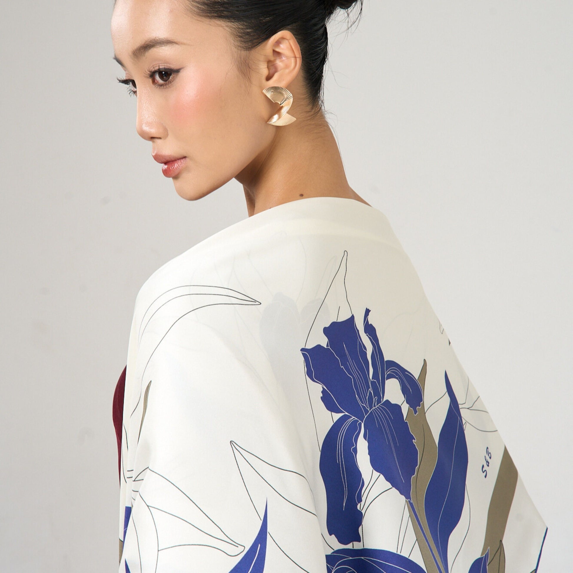 The design features deep navy botanical forms set against a soft ivory background, with muted olive accents that create depth and contrast. The composition is both striking and balanced — bold enough to stand out, yet versatile enough to pair with a wide range of wardrobes.