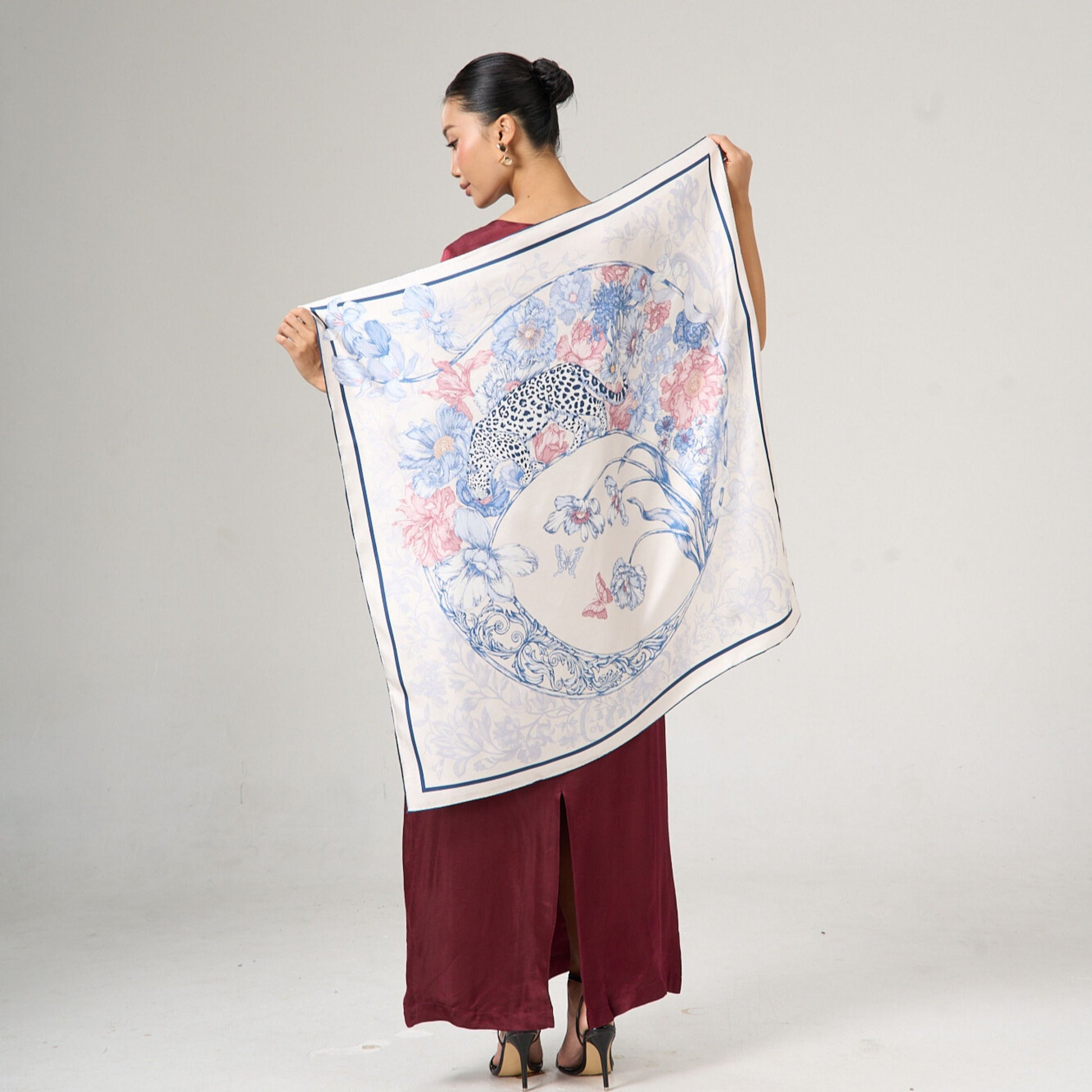 Elegant yet expressive, this silk twill scarf blends delicate florals with a striking wildlife motif to create a truly distinctive piece.